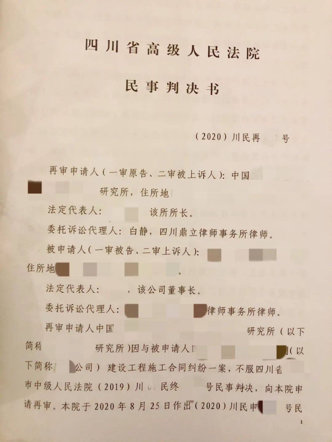 鼎立律师代理的中国某研究所军工固投项目诉施工总承包单位退还审减金额的诉讼,历时两年,经历一审胜诉、二审被改判驳回、再审立案听证和再审胜诉四个阶段,最终获得四川省高级人民法院再审判决支持。